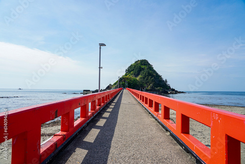 Obraz premium 由良海岸と白山島に架かる赤い白山橋(山形県鶴岡市)
