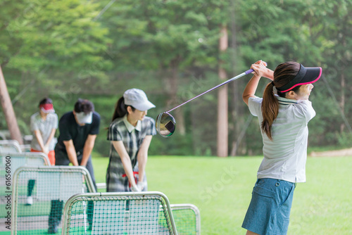 Obraz premium ゴルフ練習場・打ちっぱなし・ゴルフセンターでスイングの練習するゴルフ選手・ゴルファーの男女