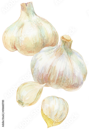Obraz premium 水彩画イラスト 2個のニンニクとニンニクのかけら 縦並び