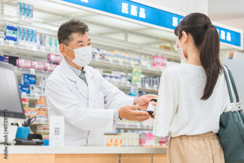Fototapeta premium 薬局・病院・ドラッグストアで働く薬剤師(処方箋・薬・サプリメント)
