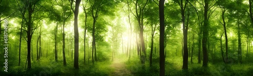 Naklejka premium 自然の緑の林の間から差し込む陽の光