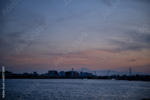 © Keiichi Wakui, Fototapeta premium 多摩川の流れとマジックアワーの空