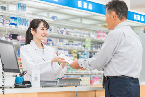 © buritora, Obraz premium 薬局で薬の相談を受ける高齢者男性と薬剤師・調剤師の女性