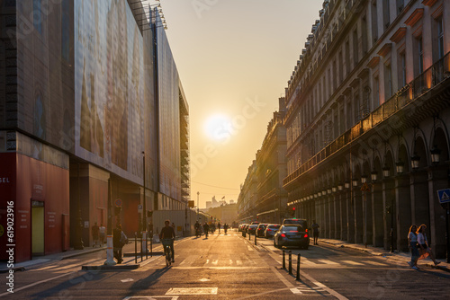 Obraz premium 夕日に照らされるパリの街並みと道路を行き交う車や通行人の交通