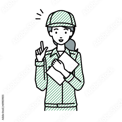 © 9bdesign, Obraz premium 立って書類を手に持って何かひらめいた作業員の女性