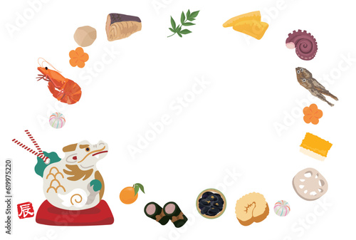 Fototapeta premium 年賀状 2024年 お節と龍の置物のイラストのデザイン