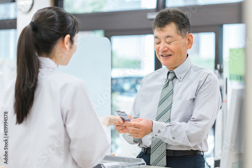 Fototapeta premium 薬局で薬剤師・調剤師に相談する高齢者・中高年男性(服薬指導)