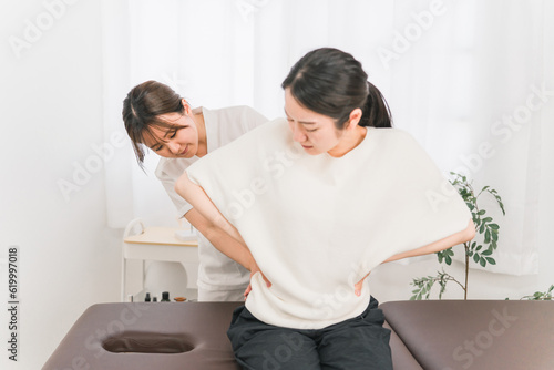 Fototapeta premium 病院で骨盤・坐骨の痛みで治療を受ける患者とアジア人女性医師・理学療法士・看護師