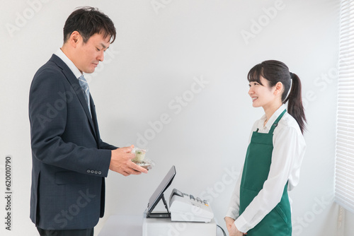 Fototapeta premium お弁当を買うビジネスマンとコンビニ店員の女性