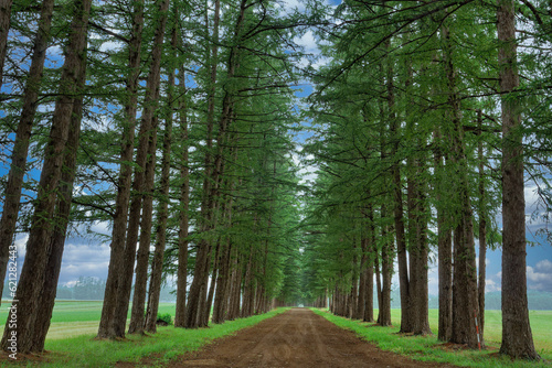 © Hitoshi, Obraz premium カラマツがそびえ立つ道