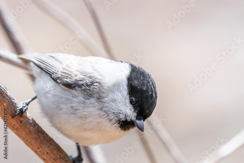 Naklejka premium 北海道洞爺湖町、森の中で木枝にとまるコガラ【4月】