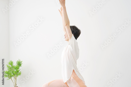 © siro46, Obraz premium 自宅でヨガのハイランジのポーズをする中年女性