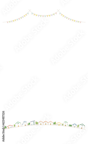Obraz premium 水彩風のかわいい街並みとガーランドのフレーム