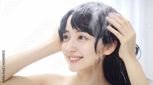 Obraz premium 笑顔でシャンプーをする女性