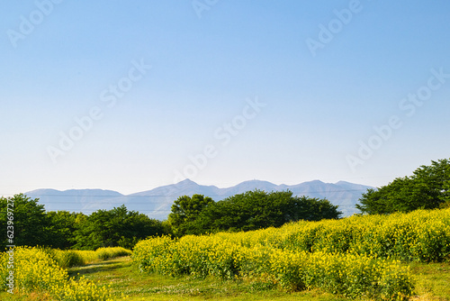 Fototapeta premium 快晴の空の下、菜の花畑の広がる美しい風景