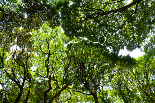 Obraz premium 公園や森の木を見上げると樹冠が広がっている風景