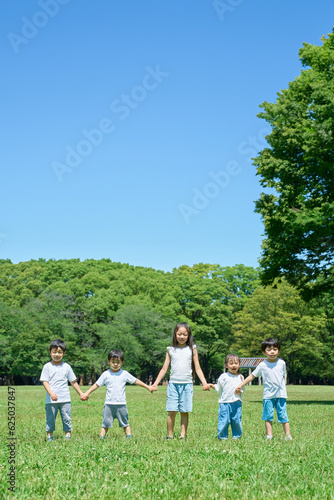 Obraz premium 草原で手を繋いで並ぶ子どもたち