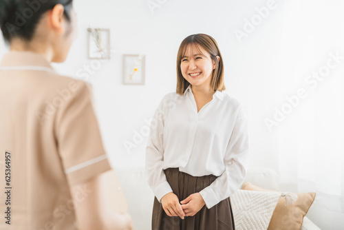 Obraz premium エステサロン・ネイルサロンに来店・来院して挨拶する女性