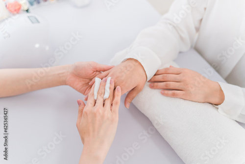 Fototapeta premium ネイルサロンでアセトンでネイルオフをするネイリストとアジア人女性