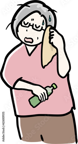 Obraz premium 夏の体調管理 汗をかいて水分補給をしたいシニア女性イラスト