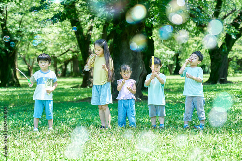 Obraz premium シャボン玉をして遊ぶ子供たち