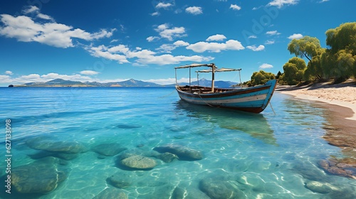 Obraz premium 美しい海の海岸付近に浮かぶ小舟