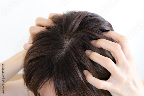 © webbiz, Naklejka premium 頭皮を抑える女性 マッサージイメージ