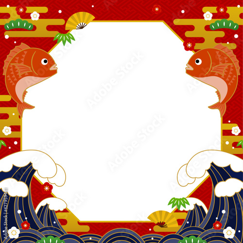 © Katie(カチエ), Obraz premium 和風 大波と跳ねる鯛、松竹梅のフレーム・背景素材(正方形)