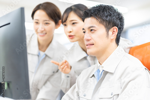 © ponta1414, Fototapeta premium パソコンを見る作業着を着た日本人