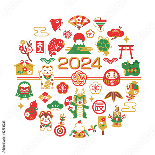 Naklejka premium 2024 辰年 龍と縁起物のイラスト