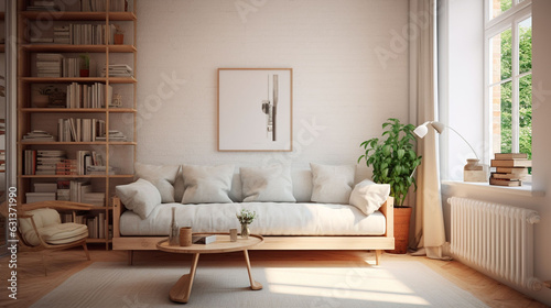 Fototapeta premium 白を基調としたリラックスできるインテリアの日当たりが良いリビング