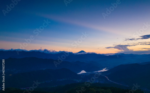 Obraz premium 夏の輝き - 山岳地帯から望む美しい富士山と相模湖の夕暮れ