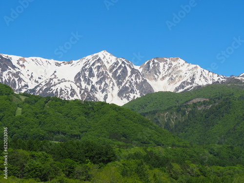 © RATM, Naklejka premium 新緑の森と残雪の北アルプス