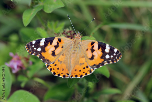 Obraz premium 野原のレッドクローバーの花から吸蜜するヒメアカタテハの成虫(晴天、屋外マクロ撮影)