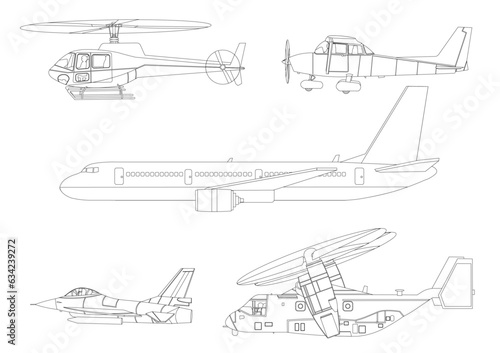 Obraz premium さまざまな種類の飛行する飛行機の線画