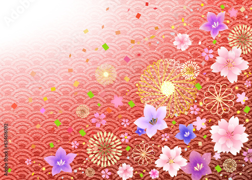 © あんもち, Naklejka premium 花と金装飾の豪華な和柄背景 高級感 青海波 年賀状 和紙 和風 キラキラ赤