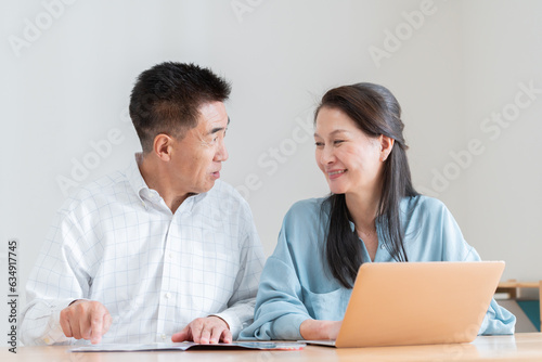 Obraz premium 旅行パンフレットを見て予約をするシニア夫婦