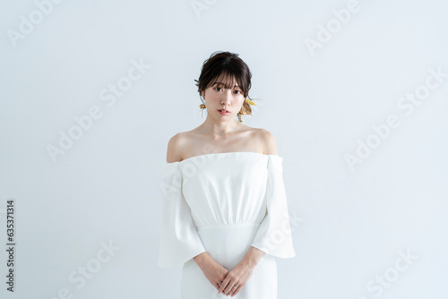 Obraz premium ウェディングドレスを着てヘアメイクをした花嫁