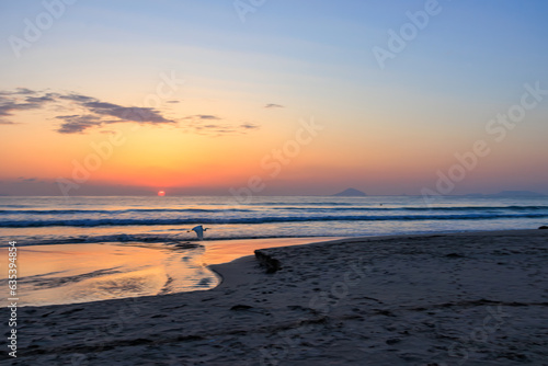 Naklejka premium 美しい日の出と白浜の波打ち際の反射 静岡県下田市白浜