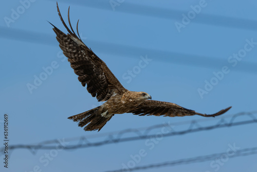 Obraz premium 電線の間を縫って飛ぶトビ