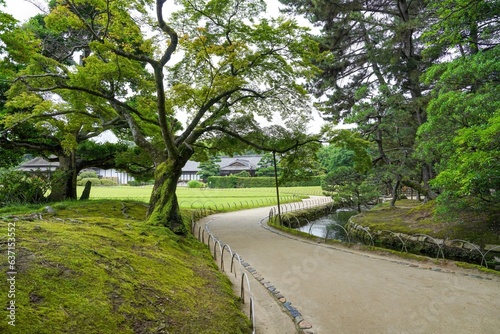 Obraz premium きれいに手入れされた日本庭園と古い茅葺きの日本家屋のコラボ情景