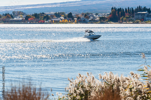 Obraz premium 河口湖を走り抜けるモーターボート【山梨県】