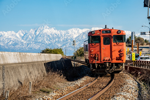 © manabu307, Obraz premium 雨晴海岸にて 海岸沿いを走る氷見線と立山連峰-3