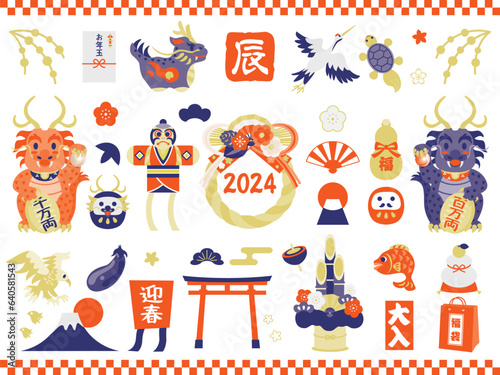 Obraz premium お正月の辰年の縁起物のイラストのセット素材