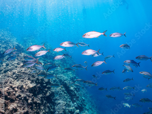 Fototapeta premium キビナゴの大群を襲う迫力あるカンパチ(アジ科)の群れ。日本国静岡県伊豆半島賀茂郡南伊豆町中木から渡し船で渡るヒリゾ浜にて。 2023年8月26日水中撮影。
