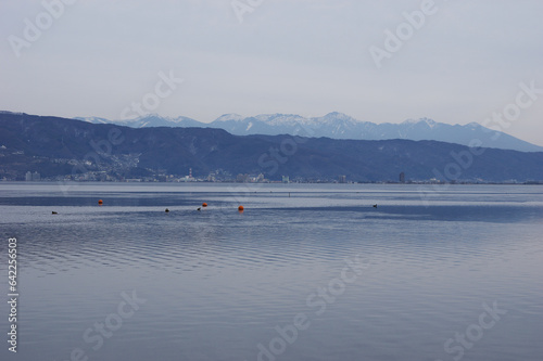 Obraz premium 夕暮れの諏訪湖から冬の八ヶ岳連峰を望む
