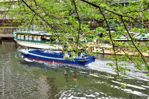Fototapeta premium 月島川水門近くに停留する屋形船と隅田川に向かうボート