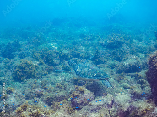 Fototapeta premium 美しく大きなアオウミガメ(ウミガメ科)。日本国静岡県伊豆半島賀茂郡南伊豆町中木から渡し船で渡るヒリゾ浜にて。 2023年9月10日水中撮影。