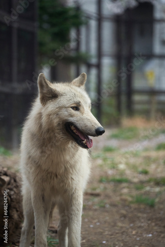 © Trojana, Obraz premium 벚꽃이 내린 철제 울타리 안의 흰색 늑대의 클로즈업