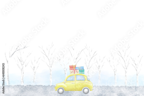 Obraz premium プレゼントを乗せた黄色い車が雪降る並木道をドライブする水彩フレーム。クリスマスや冬のお祝い向けのイラスト。